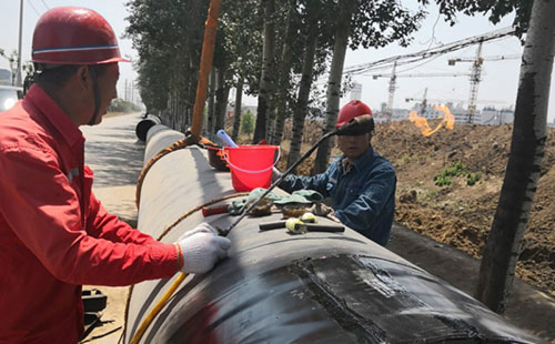 3、沿徑向把壓敏膠型熱收縮帶環繞搭接線位置,先將固定片通過加熱后粘于在熱縮敏帶搭接線接頭部位,形成一個筒式狀態。再向一端反拆去掉離型膜,隨后移至準確的作業段。開始用火焰選熱縮帶寬度的中間部位,周向均勻加熱,達到收縮。隨之再沿徑向分別向兩側加熱,達到受熱力作用收縮,內層受熱膠同時熔化包覆填充于作業表面,與管道防腐層形成緊密連續的防腐蝕保護體系。(為提高施工質量和工作效率,建議倆人在兩測配合進行)。安裝中要堅持火焰溫度均勻控制在75℃,操作中要均勻加熱,避免產生氣包和皺痕。就在操作中出現的起泡或皺折,選用滾輪工具及時趕壓排出空氣、展平皺折。整個安裝過程在均勻溫度下進行,發現套體兩端有膠溢出為宜。